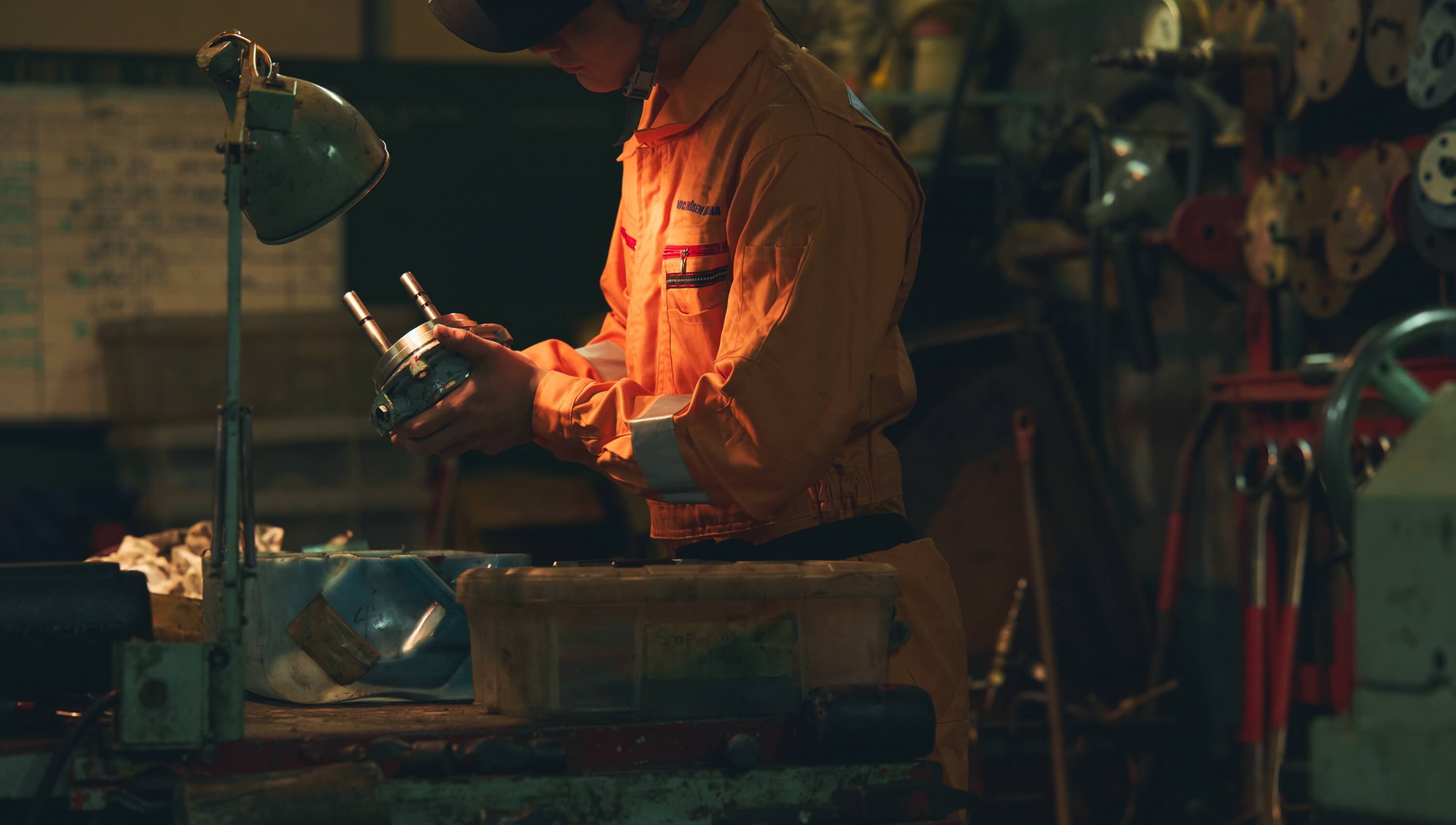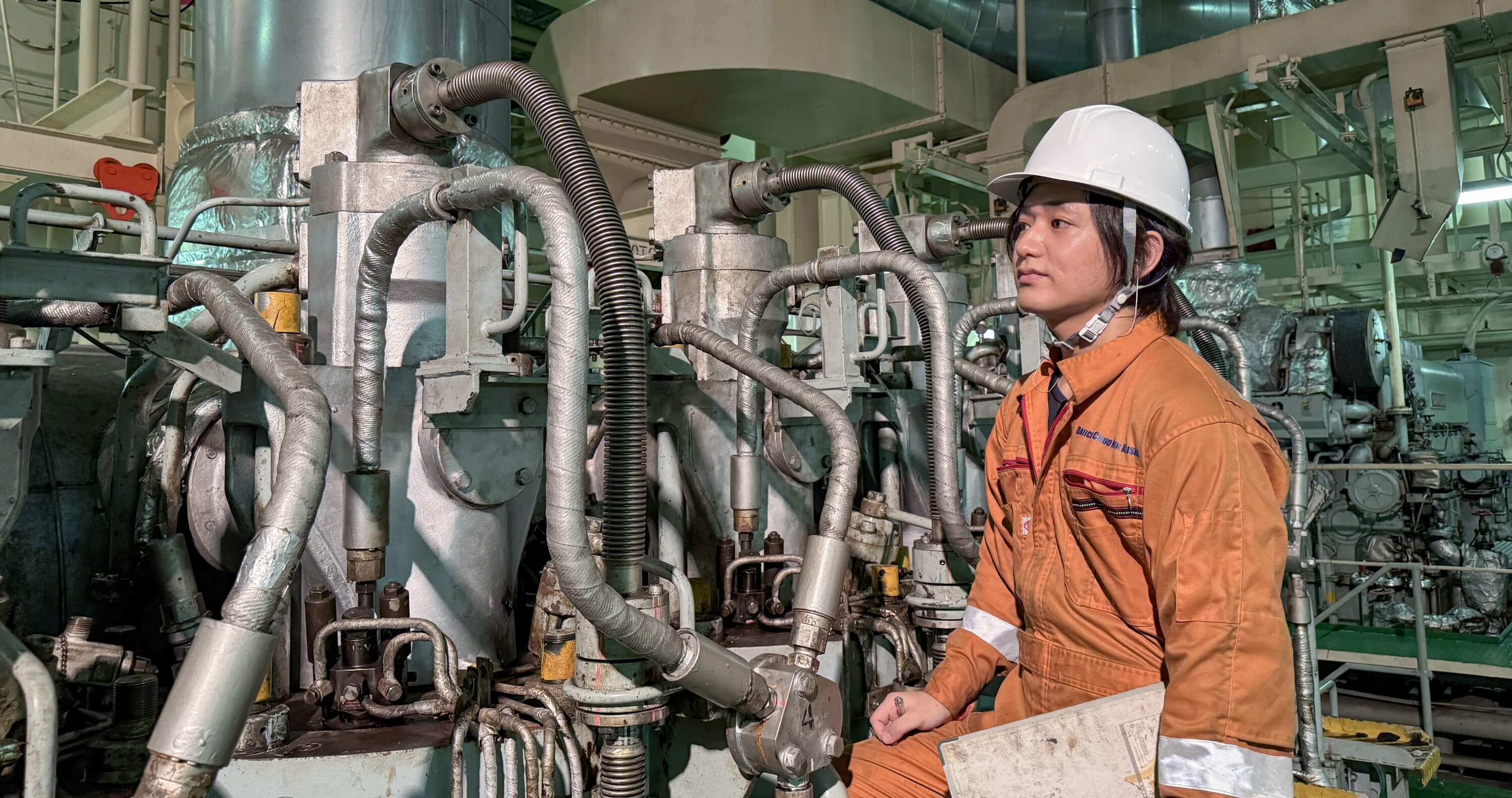 私は二等機関士として、ボイラ・排エコ・発電機原動機・空気圧縮機といった機器の保守整備や、燃料管理業務などを担当しています。三等機関士のときは、居住環境設備、ポンプなどの補器類や電気関係を担当していましたが、現在はより重要な機器を扱っています。機関士として何より重要なのは、船の運航を止めないことです。そのため、常日頃から担当機器の状態を把握して未然に故障を防ぐとともに、起きたトラブルに対しては最善の対応策を打つことをいつも心がけています。業務中は基本的に機関部にいますが、甲板部のメンバーや外国人乗組員とコミュニケーションを取ることも、信頼関係やチームワークを育むうえで大切です。船内業務や船内生活が円滑に行えるように気を配ることも、私の役目だと考えています。